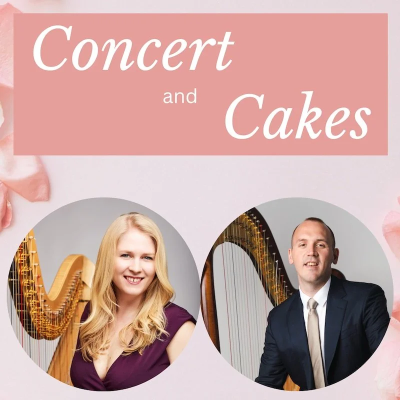 Testun yn nodi Cyngerdd a Chacennau gyda llun o Gwenllian wrth ymyl ei thelyn a llun o Llywelyn wrth ymyl ei delyn.